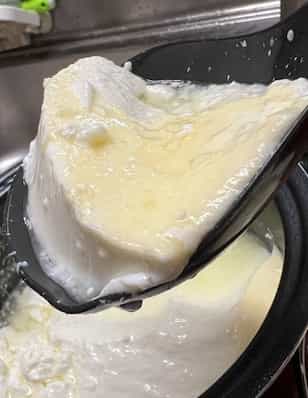 普通のヨーグルトはオタマですくうとしだいにフラット(平ら)におちついてしまうのに、チーズヨーグルトは強くて、そのままにしていても形をくずしません。