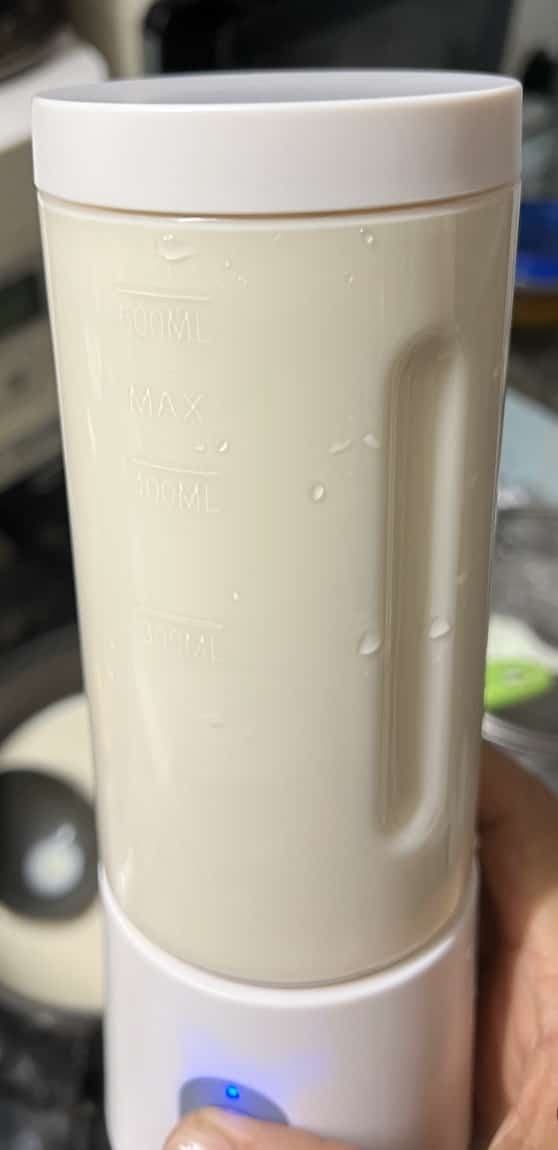 そこで豆乳や牛乳とチーズ乳酸菌をミキサーにかけてから温めています。1Lの豆乳・牛乳は〈たの研〉のミキサーで3回に分ける必要があるのですけど、2回分を残りとミックスさせるくらいでも十分です。