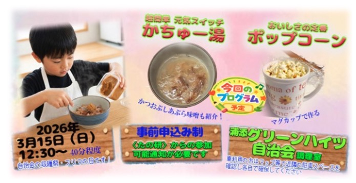 今回のプログラムはたのしい栄養士の先生と共同研究した琉球伝統の〈かちゅー湯〉と、おいしさの定番〈3分でできるポップコーン〉です。