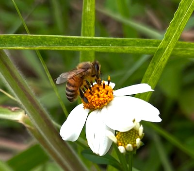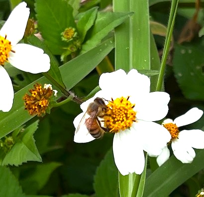 沖縄のハチミツの原料として重要なセンダングサ(シロバナセンダングサ)にはミツバチたちが集まっていました。