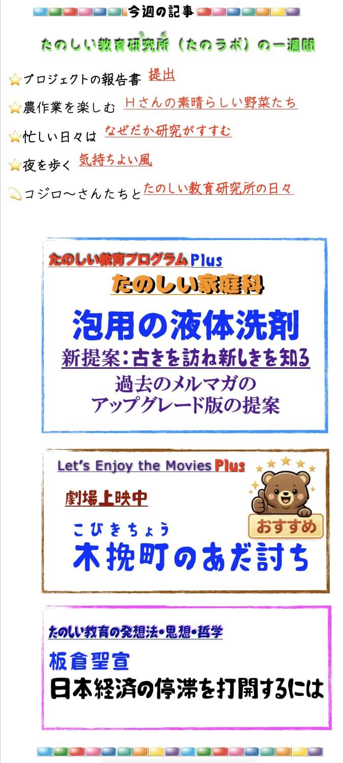 ② たのしい教育を本格的に学ぶ〈たのしい教育メールマガジン-週刊/有料〉を購読しませんか! たのしい教育の実践方法から発想法、映画の章ほか充実した内容です。講座・教材等の割引もあります(紹介サイトが開きます)