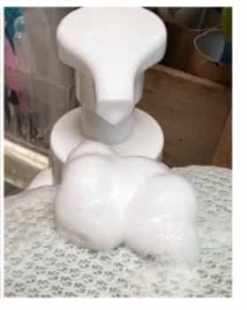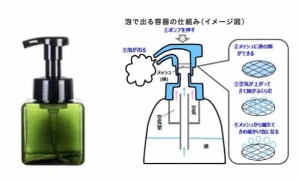 私たちの周りにはいろいろな泡立てポンプ(容器)があります、たくさんあるとはいえ基本は同じで〈液に空気を含ませてアミで泡にする〉という構造です。