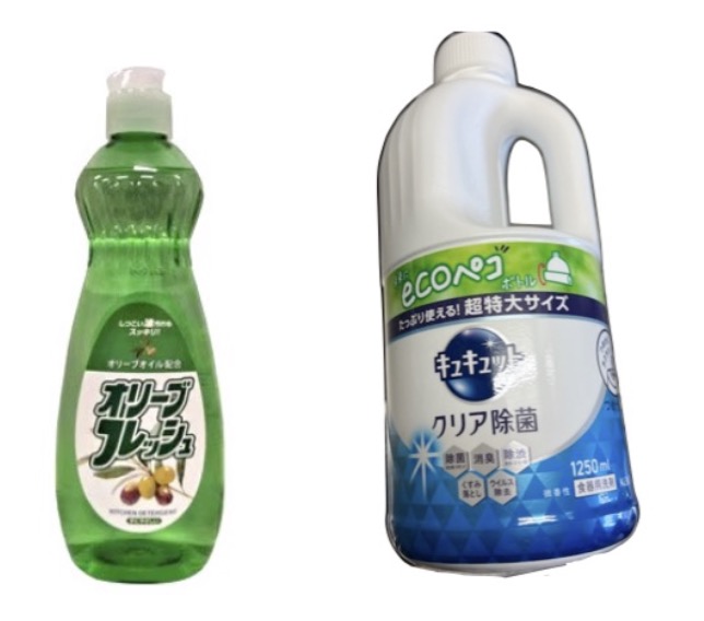 たとえば左は近くのスーパーで売っている古くからある食器用洗剤です、格安(600mlで100円くらい)です。右は《たのしい教育ラボ》でも利用しているキュキュットで、1200mlで680円です、重量比較で3倍以上高くつきます。