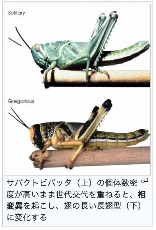 沖縄のサトウキビ畑にもいるトノサマバッタは、仲間が密集した環境で育つと、1世代(あるいは幼虫から成虫になるまでの数週間)で、緑色から黒褐色になり、羽が長くなり、筋肉のつき方まで変わる「群生相」へと姿形を変化させます。