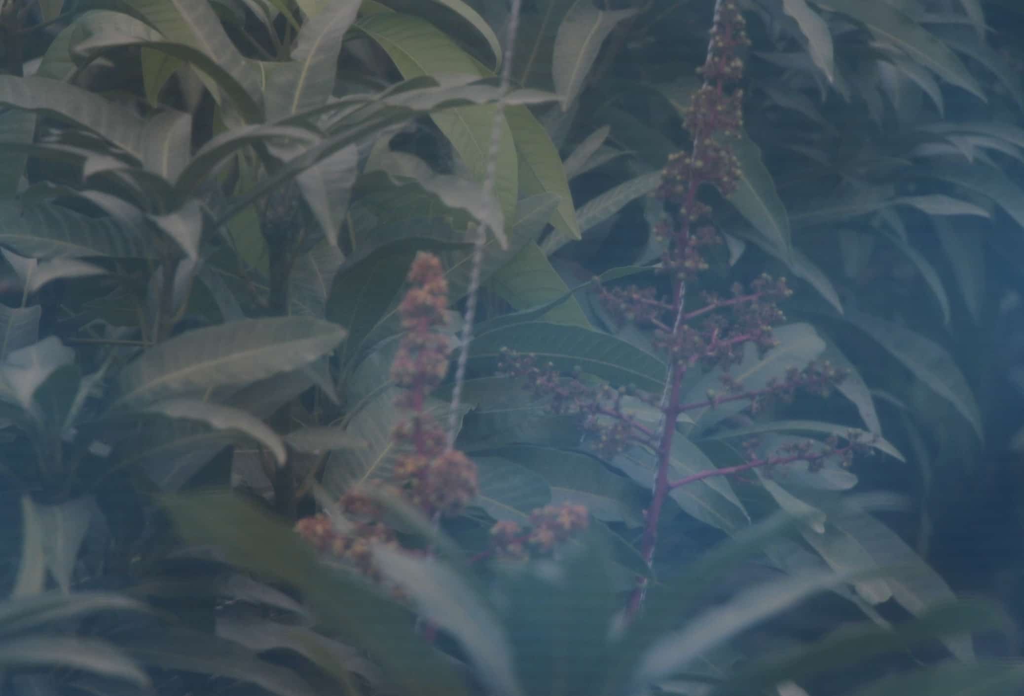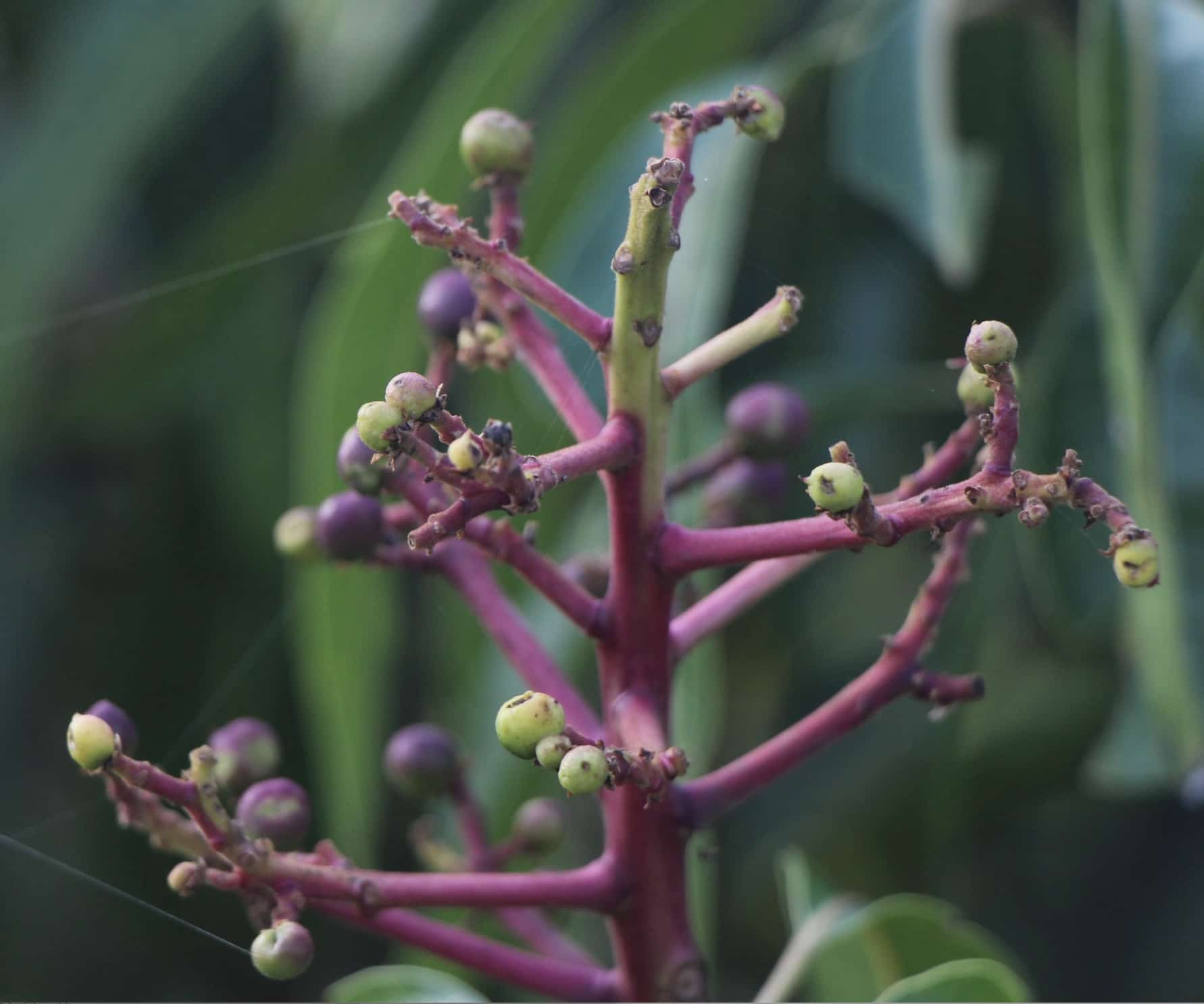 これはよく歩く畑道に生えている〈マンゴ〉の木に成った実です、5mm以上はあります。この一つ一つがマンゴになるんです。