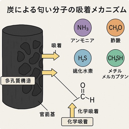 炭にはとてもたくさんの穴(孔:あな)が開いていて、そこにアンモニアや酢酸など匂いの素となる分子がたくさん入り込んでいます。