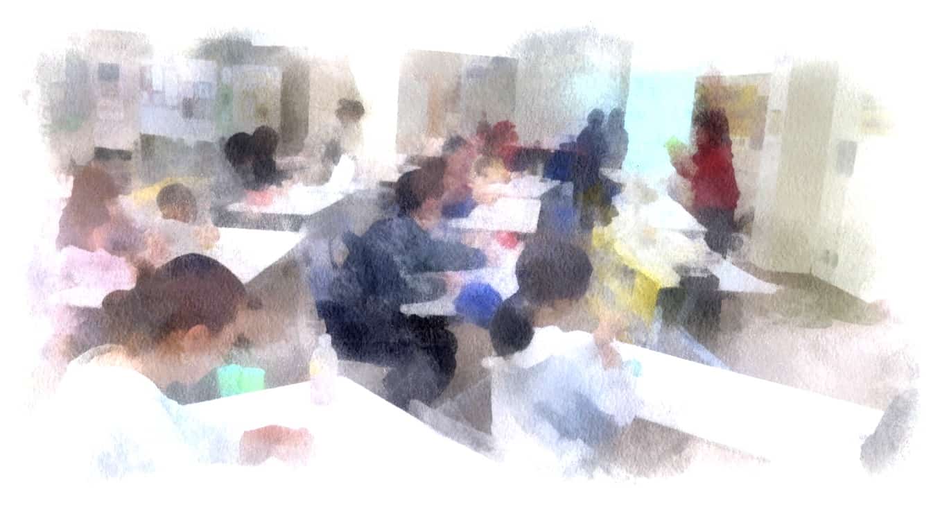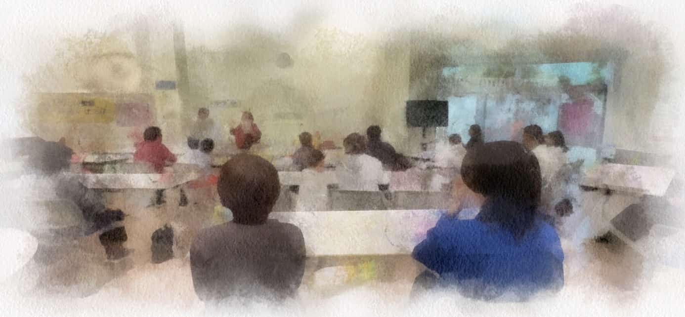 最初の画像は、沖縄でたのしい絵画を広めた小禄和子先生のワークの様子です。私は敬意を込めて、沖縄のたのしい絵画指導のレジェンドと伝えています。