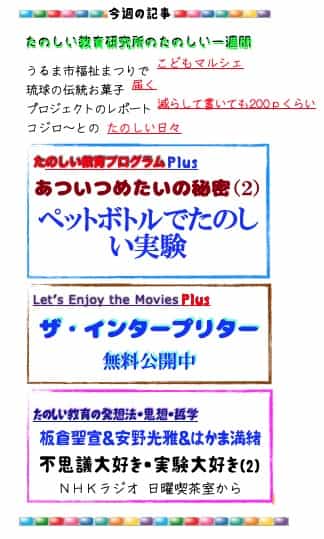 ② たのしい教育を本格的に学ぶ〈たのしい教育メールマガジン-週刊有料を購読しませんか! たのしい教育の実践方法から発想法、映画の章ほか充実した内容です。講座・教材等の割引もあります(紹介サイトが開きます)
